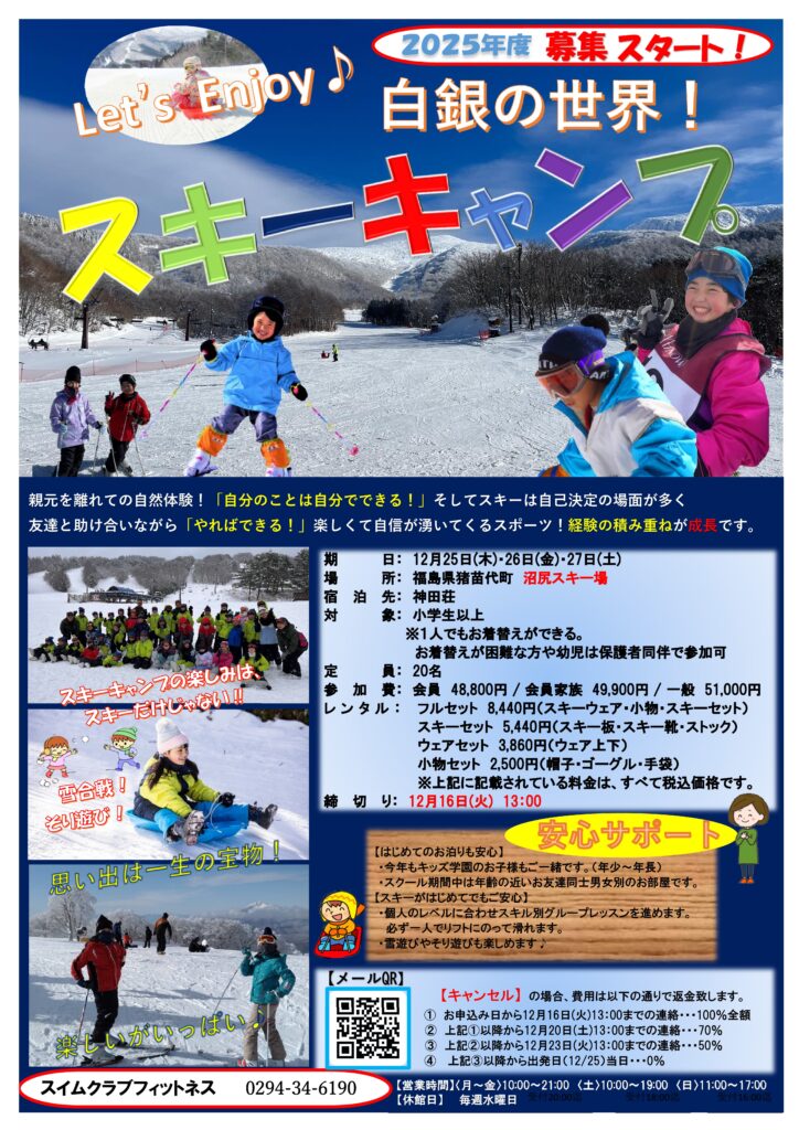 こんにちは。スイムクラブフィットネスです(*^-^*) みなさま大変お待たせしました。2025年スキーキャンプ参加者募集がスタート!スキーの醍醐味は、何といっても白銀の世界。雪山を滑り降りる爽快感は、大人も子供も一緒。そり遊びや雪遊びなど、楽しいこと盛りだくさんです!「参加したいがはじめてで不安」なことがあれば、フロントまでぜひお声掛けください!「Let’s Enjoy ♪」皆さまのご参加お待ちしてま~す!(^^)!