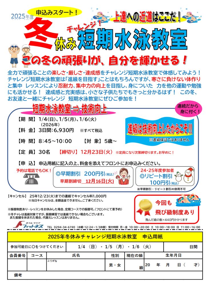 こんにちは。スイムクラブフィットネスです(*^-^*) 冬休みチャレンジ水泳教室の募集が始まりました。今回は、年明け1/4(日)~1/6(火)の3日間!技術向上と進級を目指して、みんなで頑張ろう!!ご参加お待ちしております!(^^)!