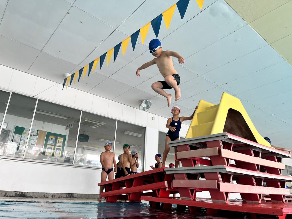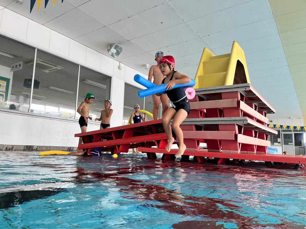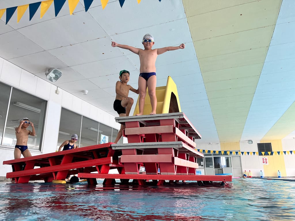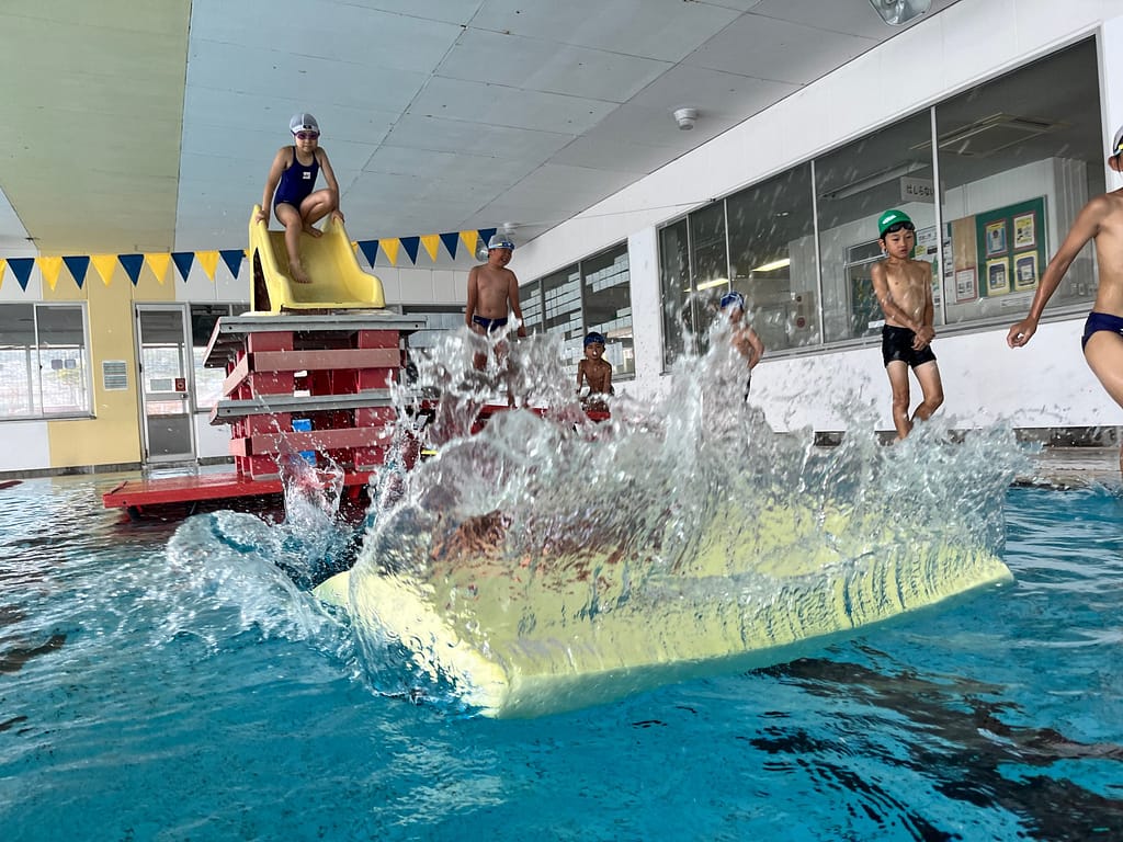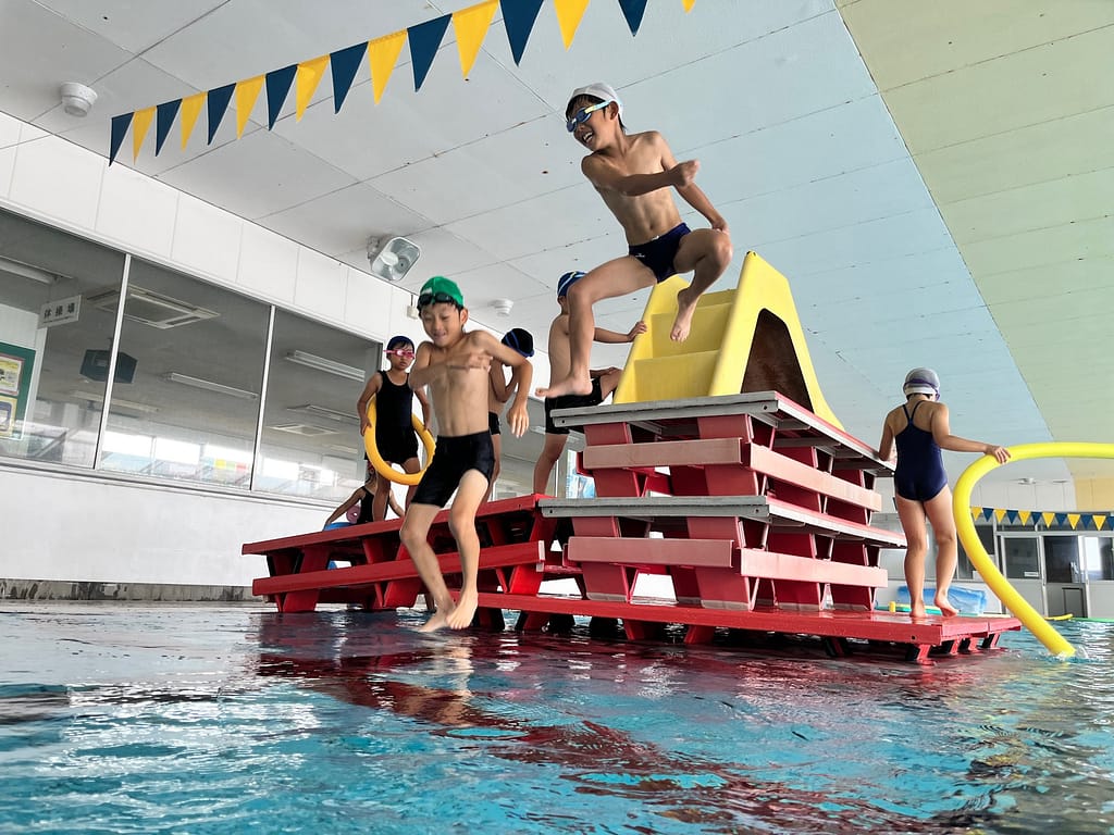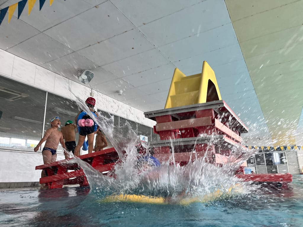 スーパー滑り台ダイブチャレンジでは、高い滑り台から浮き島へ跳び乗る、プール貸切りだからできる遊びです😁