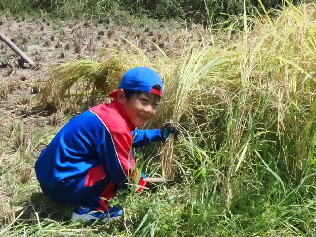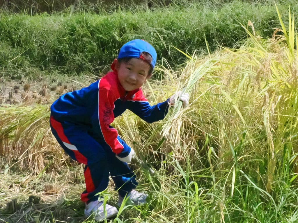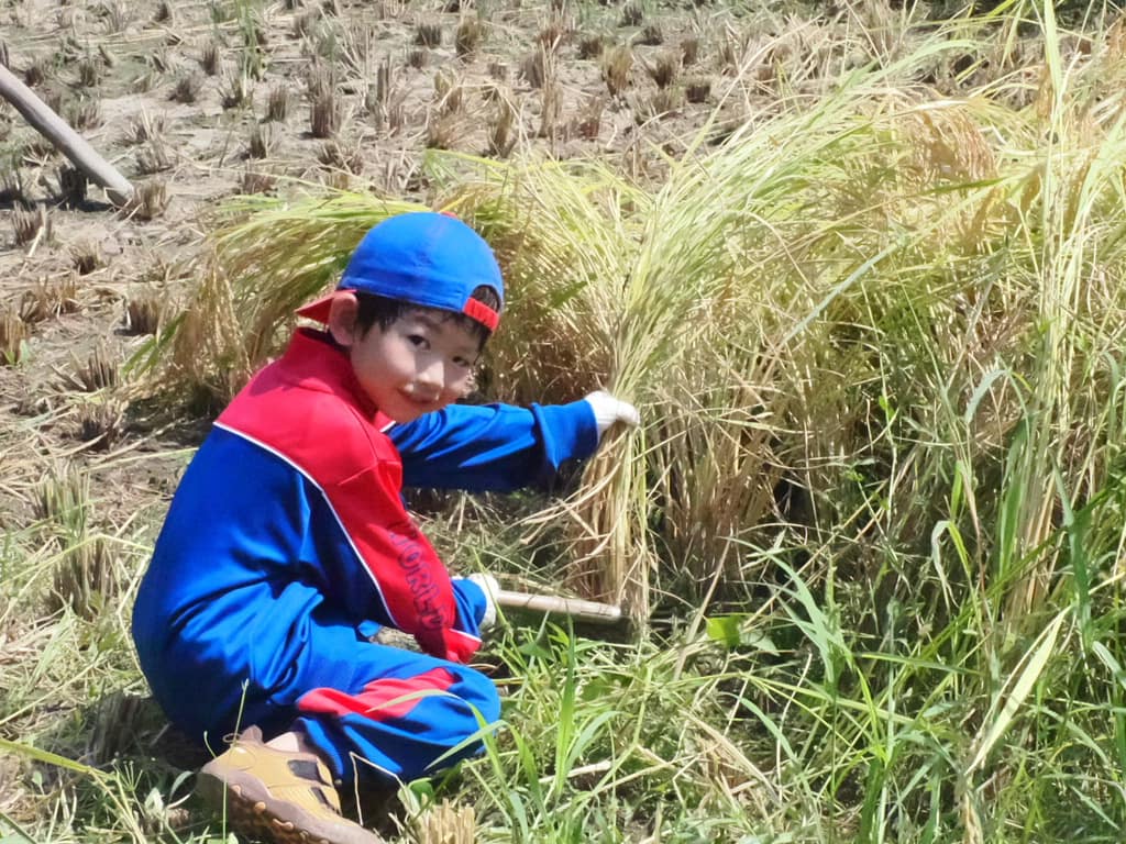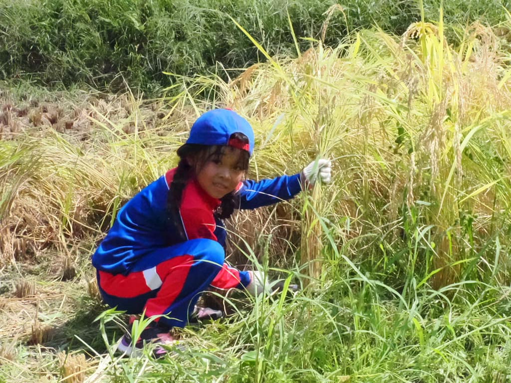 子どもたちは鎌の使い方を教わり、鎌を使って刈り取ります。安全な使い方を知れば、便利に使うことができることを学びます。