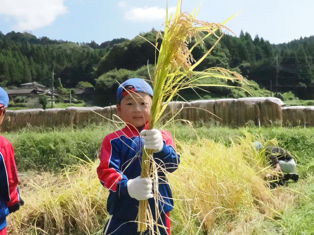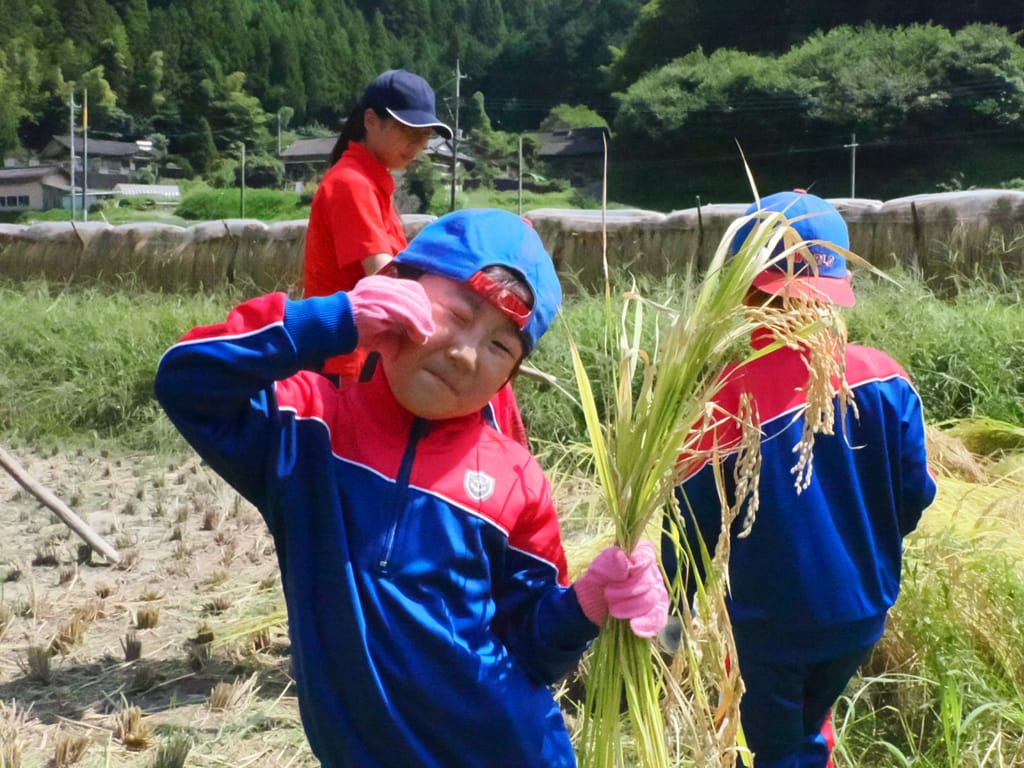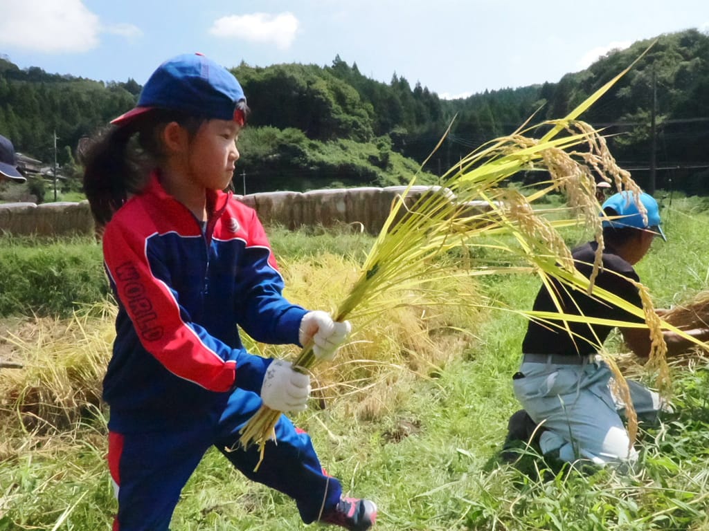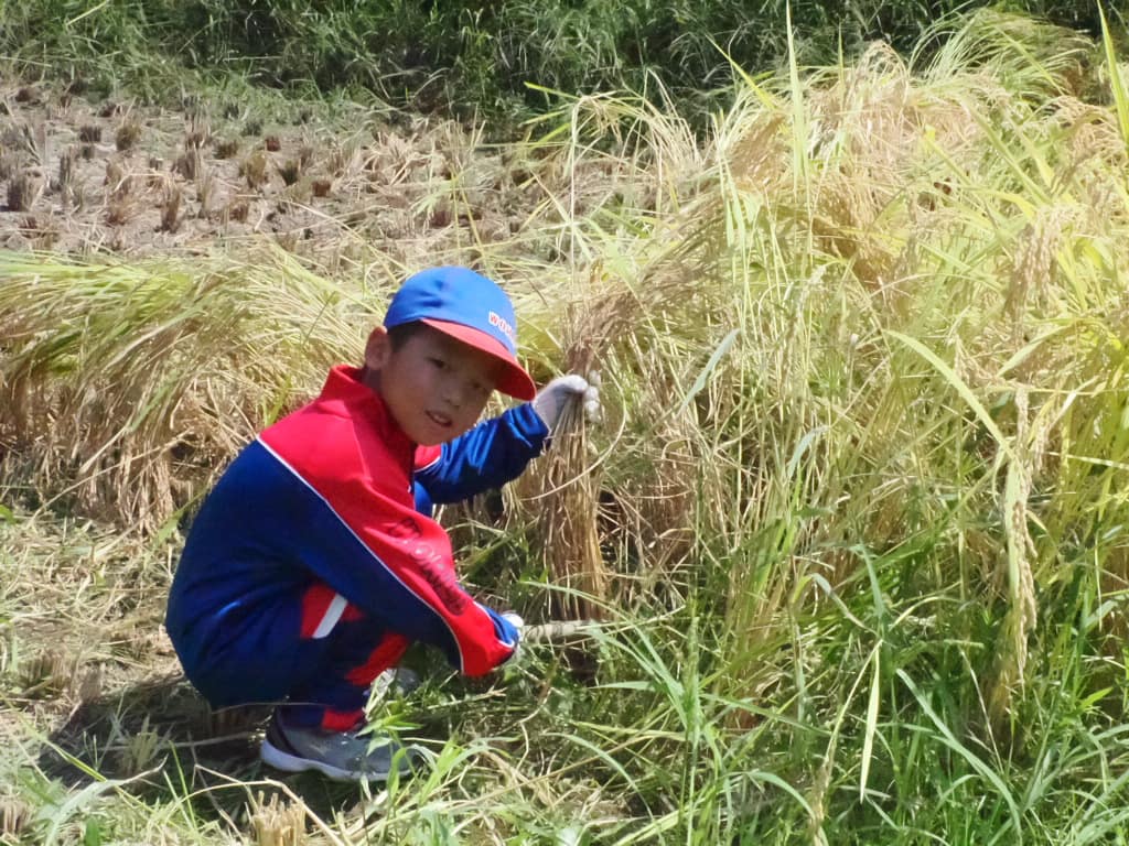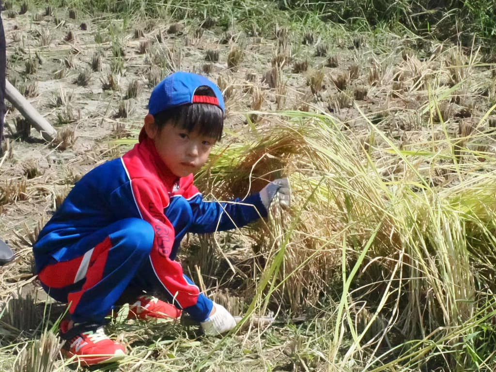 子どもたちは鎌の使い方を教わり、鎌を使って刈り取ります。安全な使い方を知れば、便利に使うことができることを学びます。