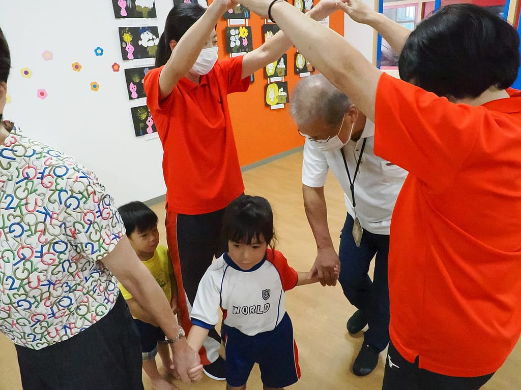 その次に、大きな輪になり「おせんべ」と「とうりゃんせ」を行いました。「おせんべおせんべやけたかな」の歌に合わせてシニアの3人のお友達が手を叩いて回り、2回叩いてもらった手がやけました♬とうりゃんせでは先生達の門につかまった人がラッキーということになりました♬