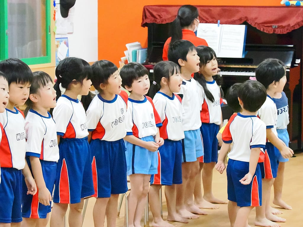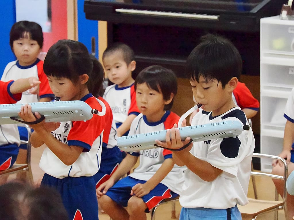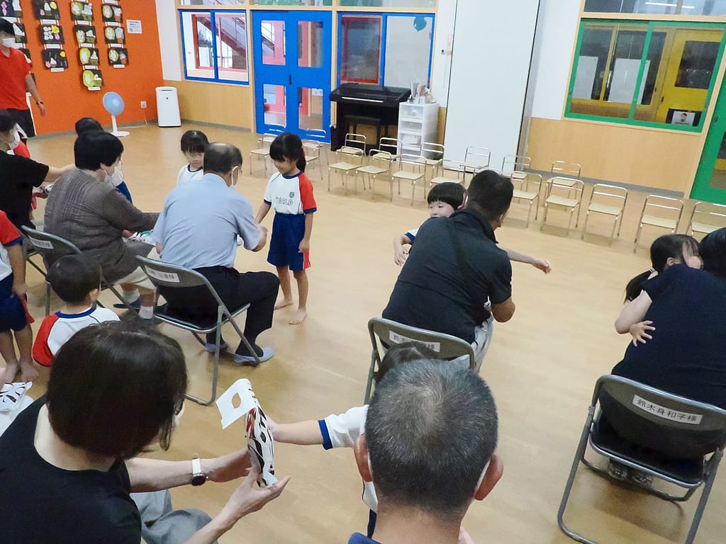 ゲームが終わって終わりの会です。シニアさんが代表してかっこよく日頃の感謝を伝え、みんなでいつもありがとうを伝えました。そして、「とんぼのメガネ」「運動会の歌」の歌を、シニアさんがピアニカの演奏をプレゼントしました♬また、シニアさんが作ってくれたやっこさんのしおりと園長先生からお菓子のお礼をプレゼントしました☆