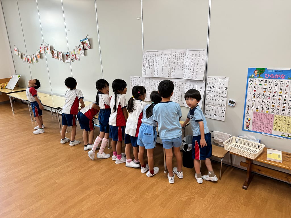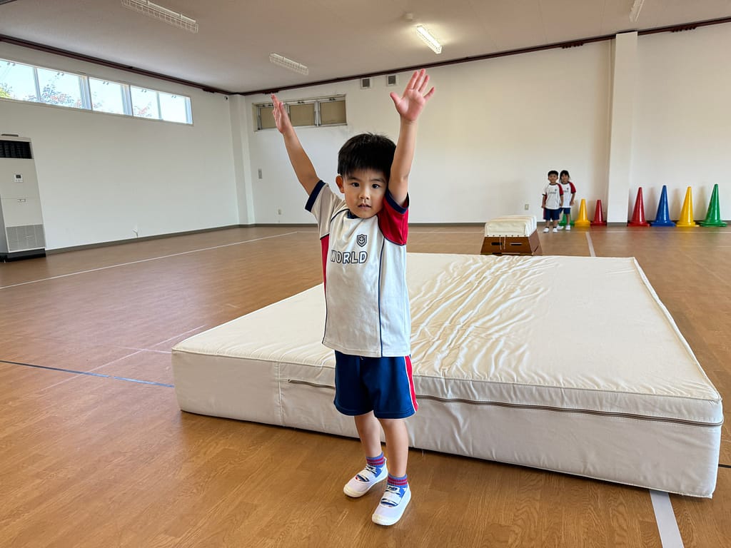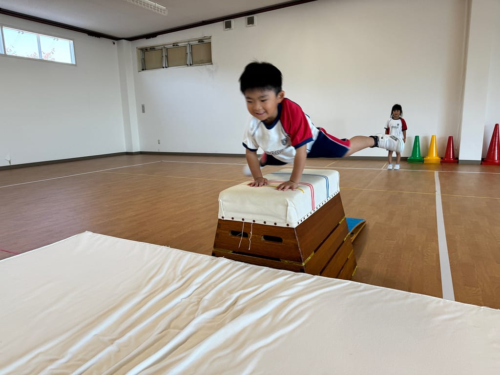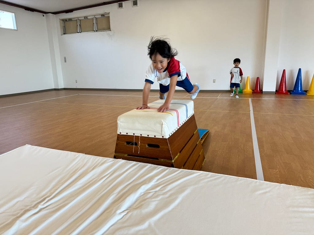 ミドルクラスは体育授業で跳び箱です。小学生用の跳び箱で練習しています。