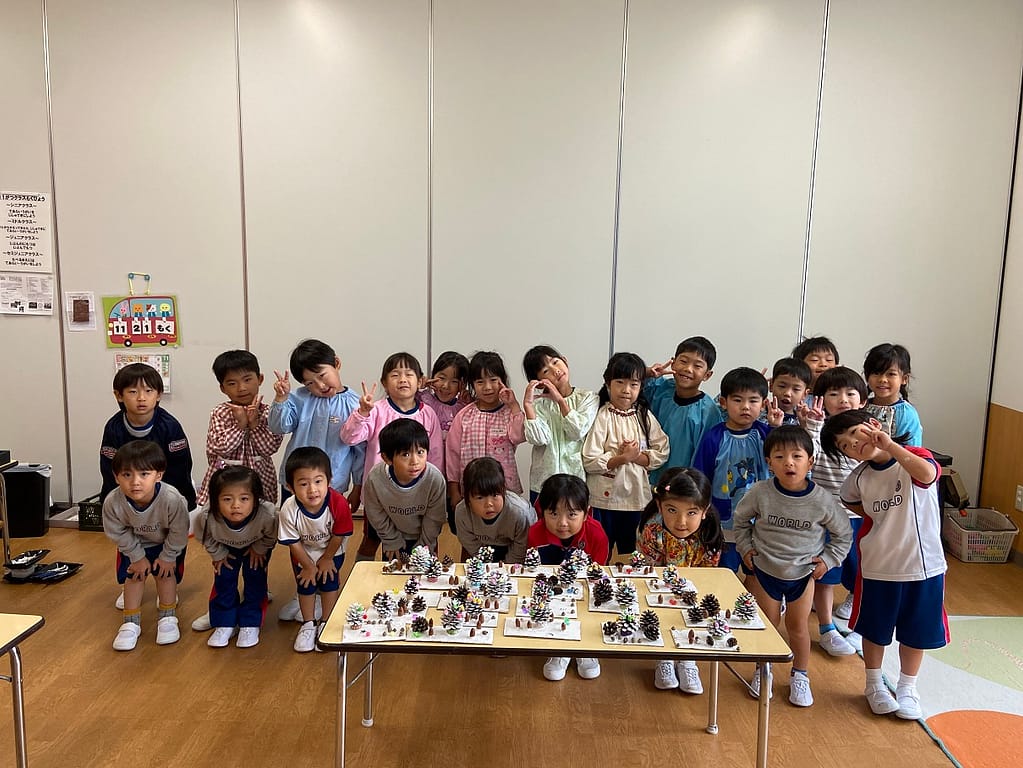 11月のお楽しみ会は「まつぼっくりツリーづくり」を行いました!松ぼっくりに白い絵の具で雪みたいに塗って、ポンポンやビーズの飾りを付けました☆段ボールの台も白く塗って、自分の好きにどんぐりや松ぼっくりを付けました!みんなとっても上手にできましたね♡クリスマス会の日に飾って、お父さんお母さんに見てもらおうね!