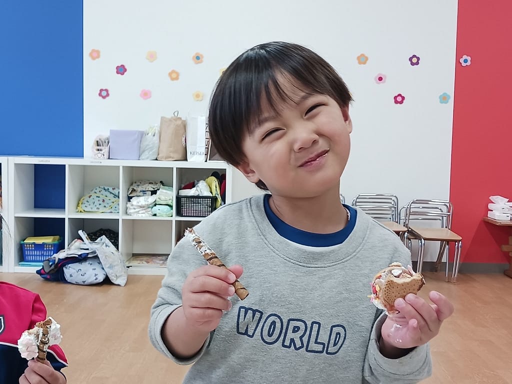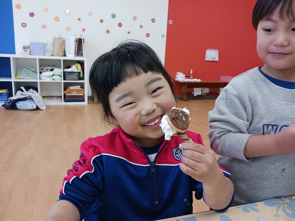 今回の土曜保育は、クリスマスおやつ作りでした😄当日のお楽しみになっていたので、ワクワクドキドキしていたようです✨生クリームやジャムをたっぷりつけて、美味しいね☆
