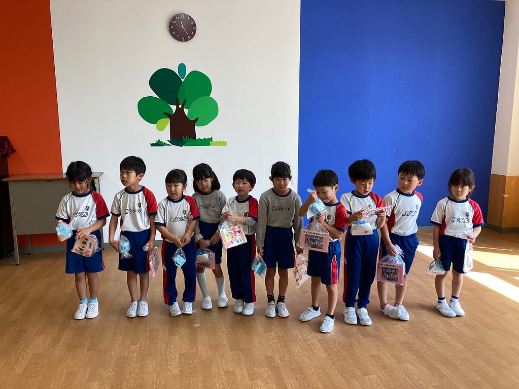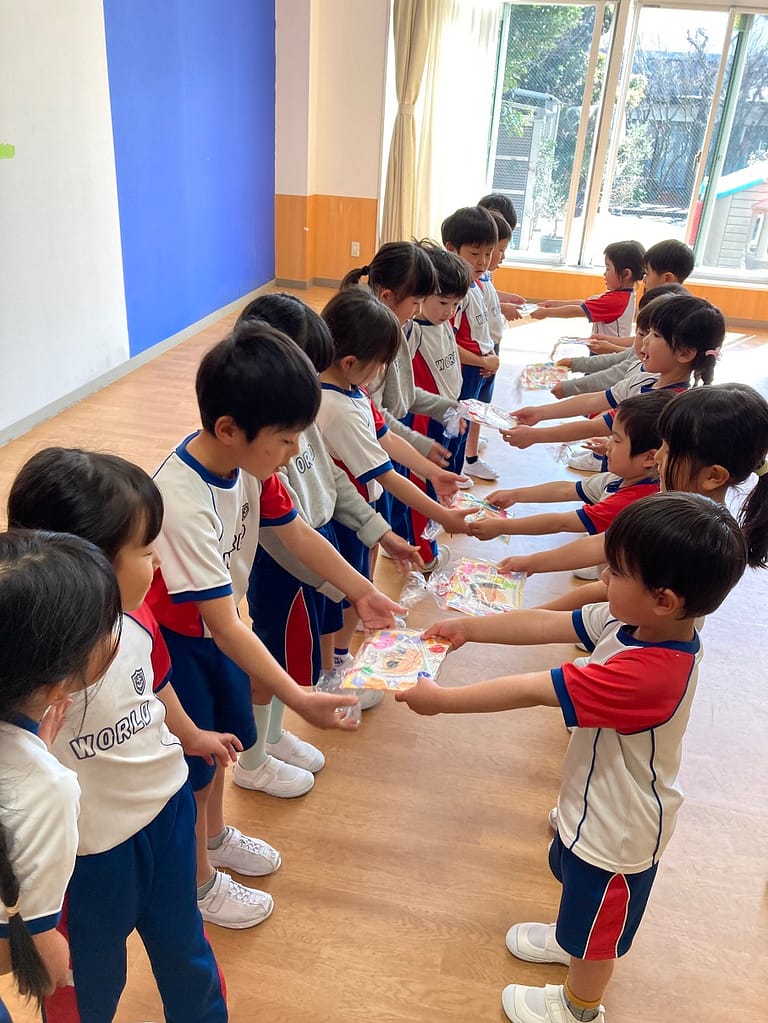 入園から今までワールドでよく頑張りましたね!みんなはとってもかっこいいお兄さんとお姉さんでした。小学校に行っても「やればできる」の気持ちで、何事にもチャレンジし一生懸命取り組んでほしいと思います。みんなの活躍がとっても楽しみです。4月になったらランドセルを背負ってワールドに遊びに来て下さいね!!先生達みんな待っています。