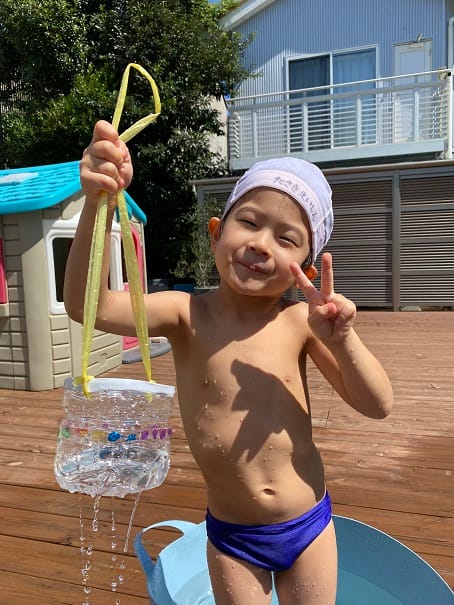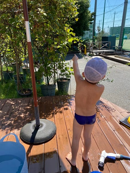 9月6日土曜日土曜保育を行いました。9月ですがまだまだ暑いので、お外で水遊び!2ℓのペットボトルの下の部分を切り、キリでたくさん穴を開けてマイじょうろを2つ作りました!油性ペンで好きにお絵描きをしたよ。