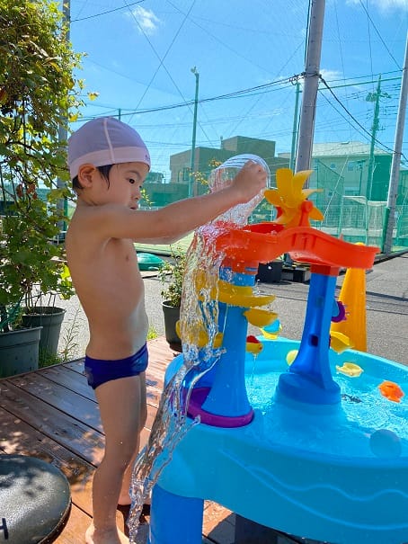 お外に出て、早速遊びましょう‼お水を入れると穴からたくさんの水が出てきてとっても綺麗☆ペンで描いた絵も一緒にキラキラしていました♪夢中になってたくさん遊んだよ!暑い日は、もうちょっと水遊びができそうですね♡