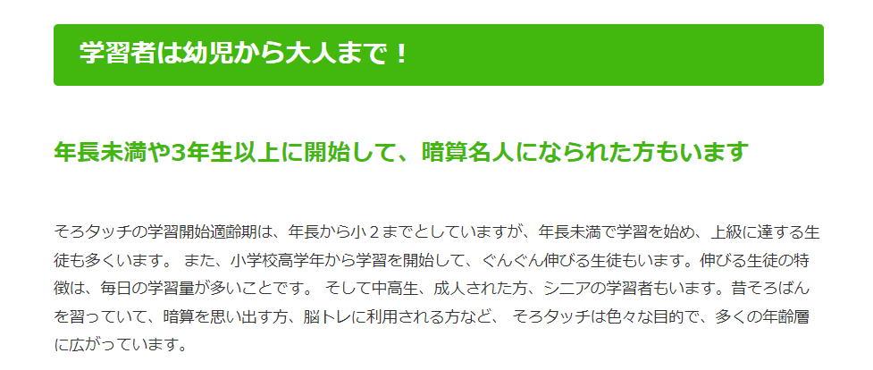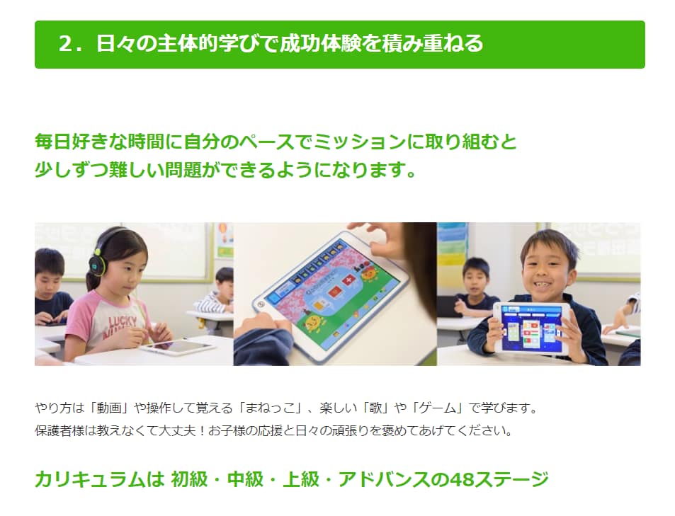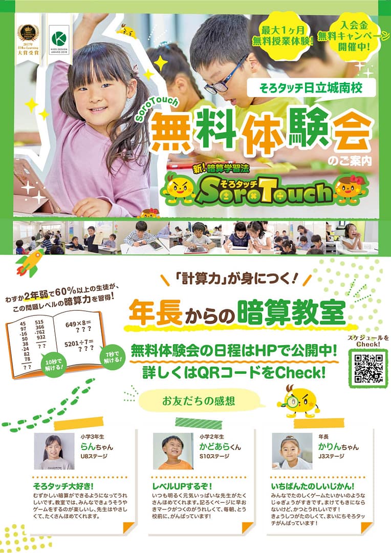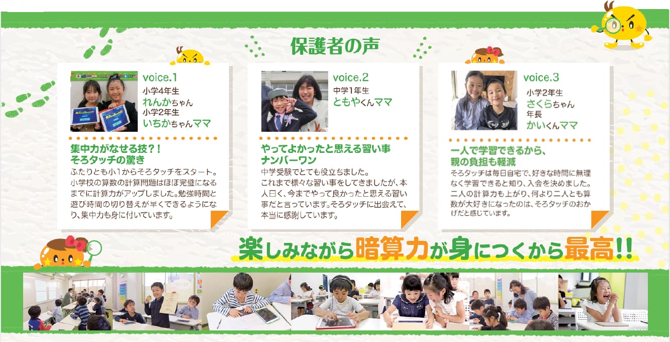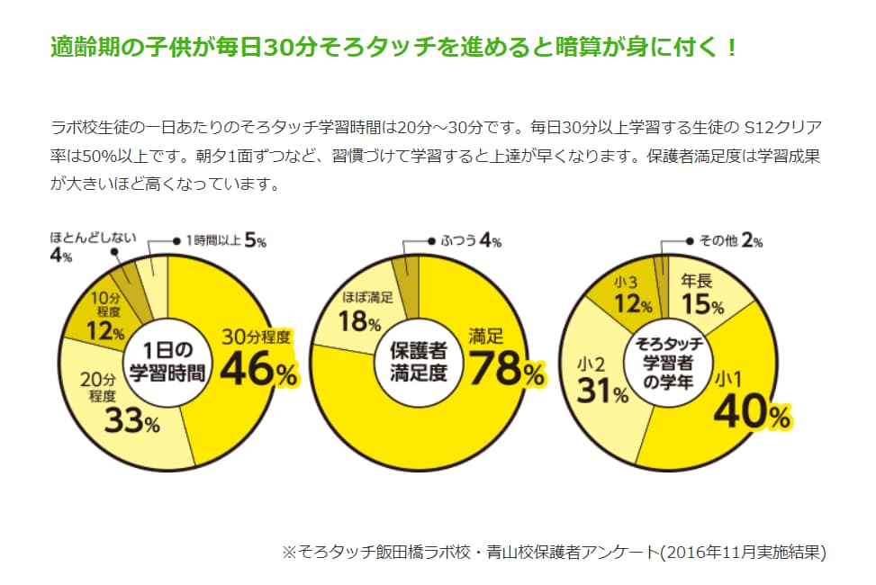 そろタッチ教室は、ネット生では味わえない、身近な仲間との競争や全員で協力・チームで協力でクリアする対抗戦で、身につけた暗算能力をタブレット以外のどんな状況でも発揮できるようアウトプットします。ネット生より教室生の方が、学習量、進度、継続期間、上級達成率すべてにおいて高い結果となりました。(2021年実績より)