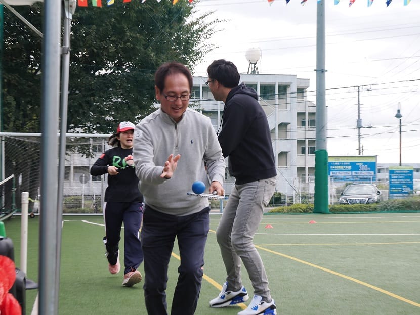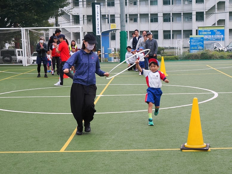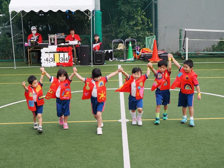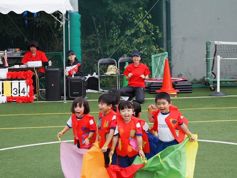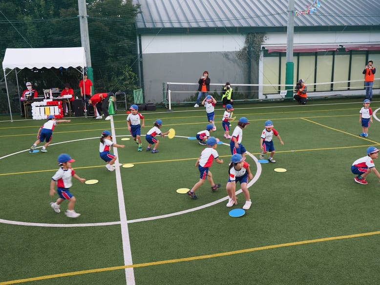 ダンス発表のあとは親子で「からだ☆ダンダン」を踊りました♪いっぱい練習したので元気にできたね!そのまま親子競技・フープで手つなぎリレーを行いました。親子でフープを握り走ります。ママとパパと一緒で嬉しそう♡赤組が勝ちました。最後の競技は父母と職員とシニアミドルさん参加のリレーです。子ども達はボールを手に持って2周走ります。父母はバトミントンラケットにボールを乗せ1周走りました。白組の勝ち~!保護者の皆様ご参加、誠にありがとうございました。